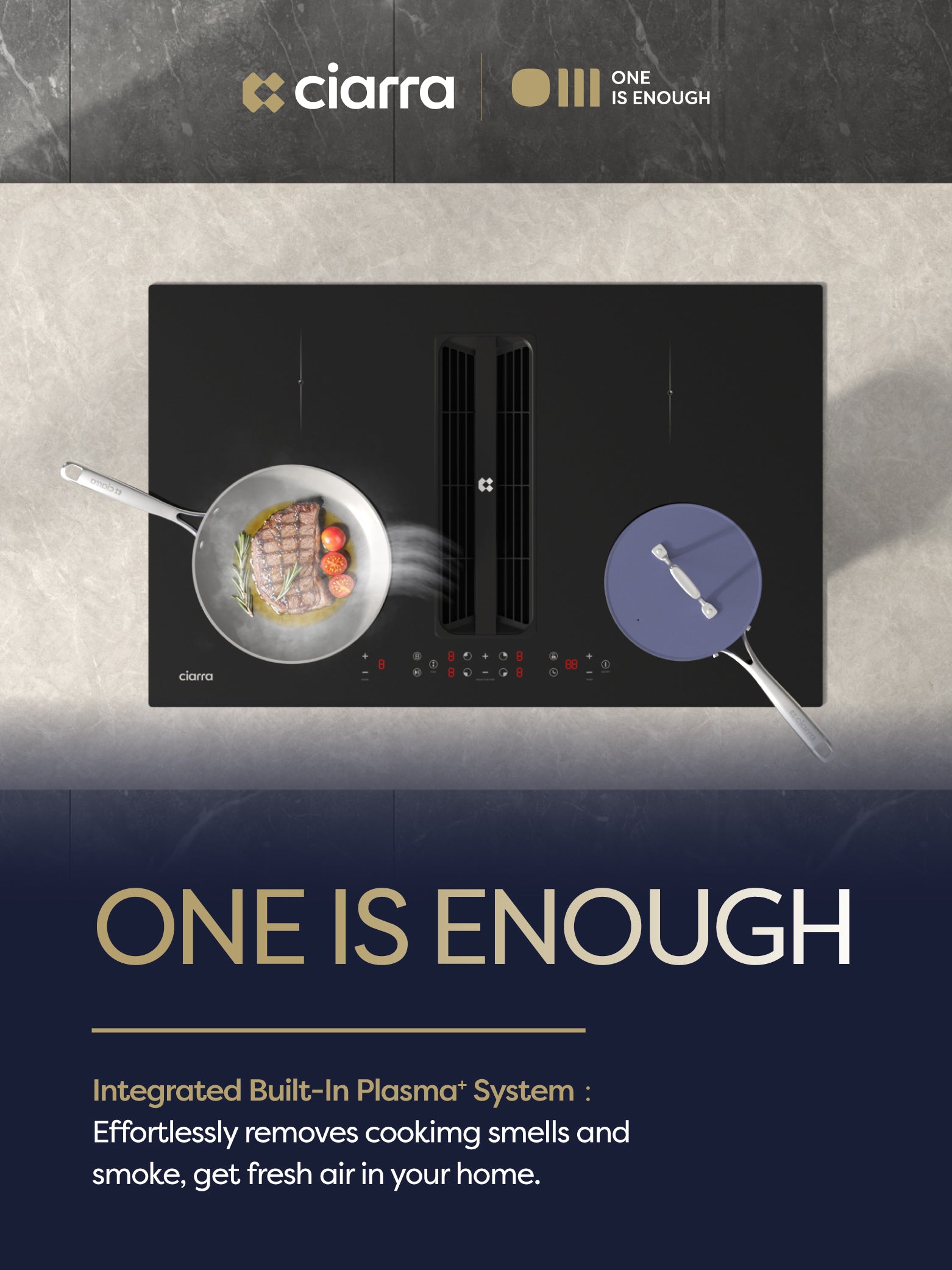 Ciarra ONE The World's Thinnest Downdraft Cooktop with the First Built-In Plasma+ System for Superior Odor Elimination