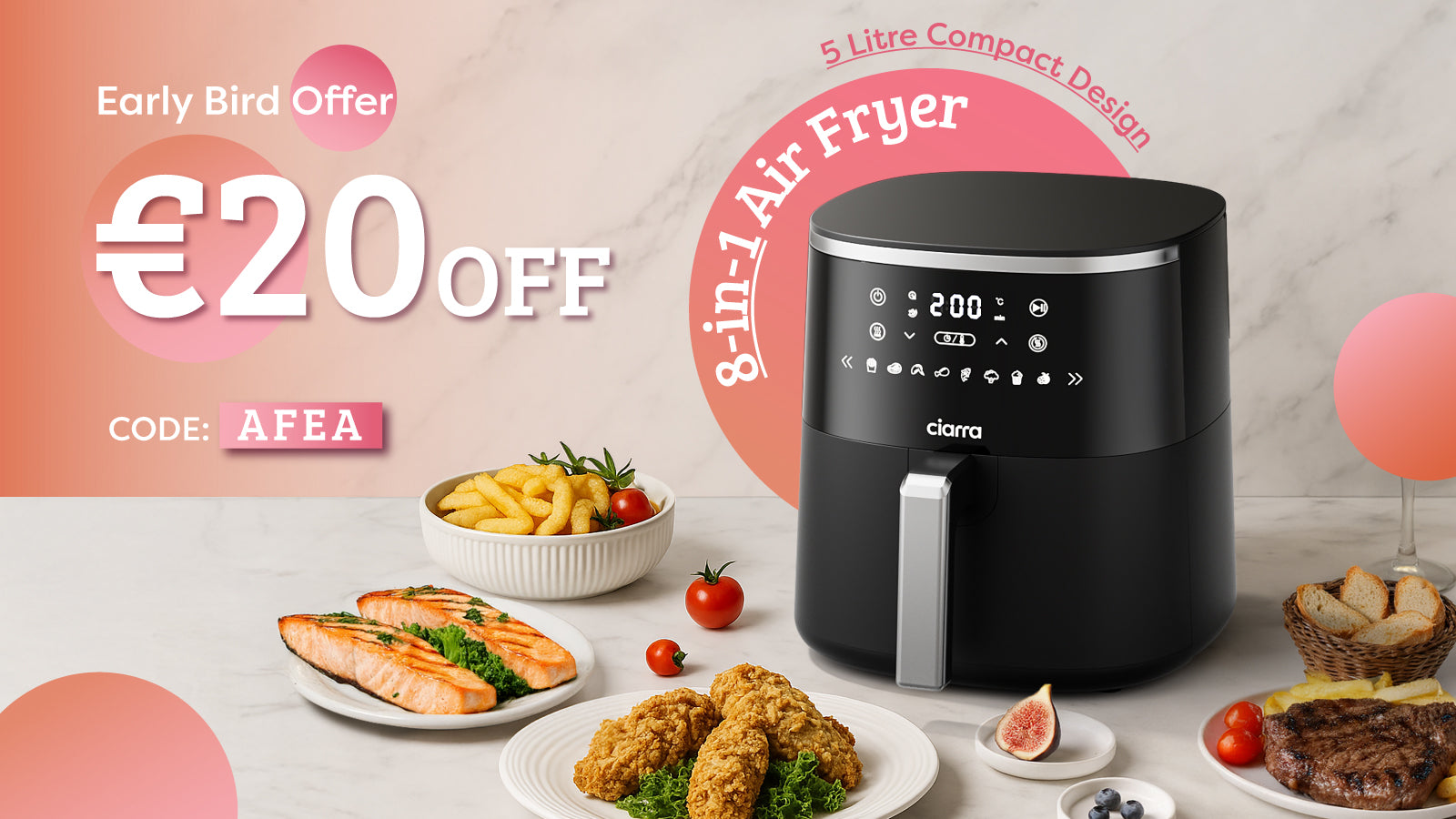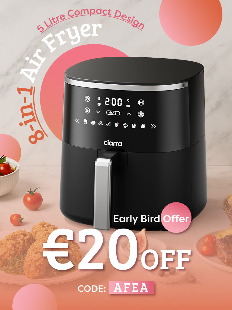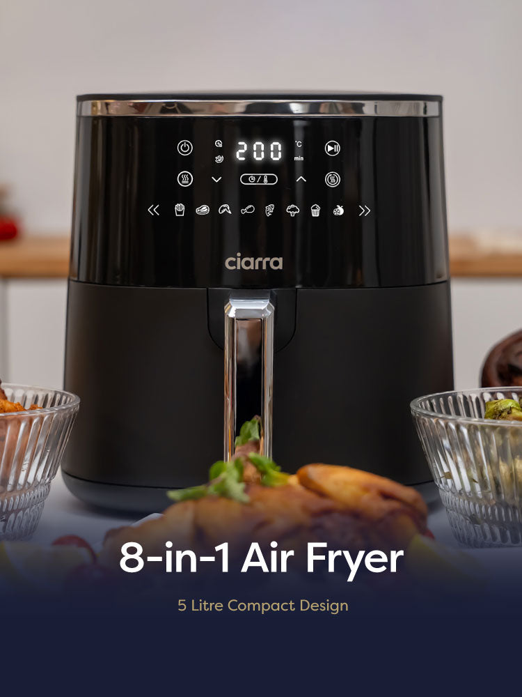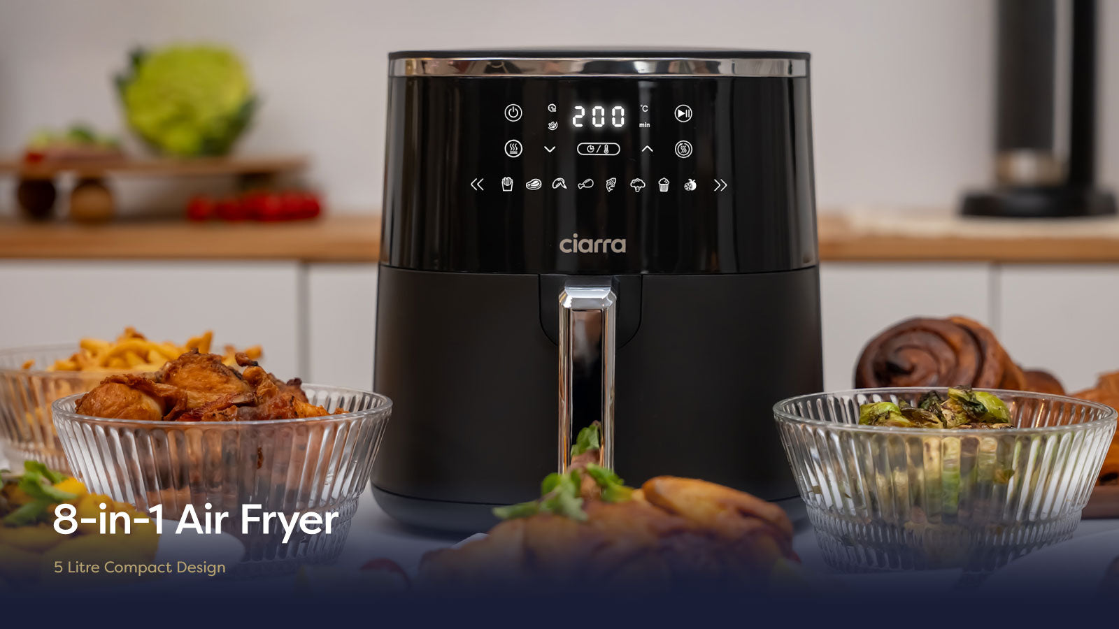 "Today, I'm introducing @ciarra's new product: the 5-liter air fryer, ideal for families of 2 to 5! Compact, easy to store and clean, it features intuitive touch controls and 8 preset cooking functions. "