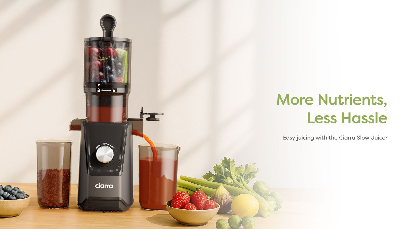 "Easy to use! Great for soft fruits like oranges and harder ones like carrots too. I’ve tried several juicers before, and this one is by far the most efficient. "