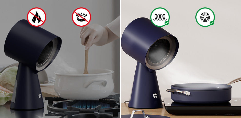 - ⚠️Attention⚠️: HOOD TO GO is recommended for use with cooking appliances (eg. induction cooker, electric grill, electric heating cooker, etc, and can not be used for open flame cooking. The air inlet should be as close as possible to the cooking surface of other appliances (no more than 10cm away) to improve the efficiency of the extraction rate.