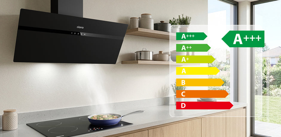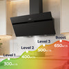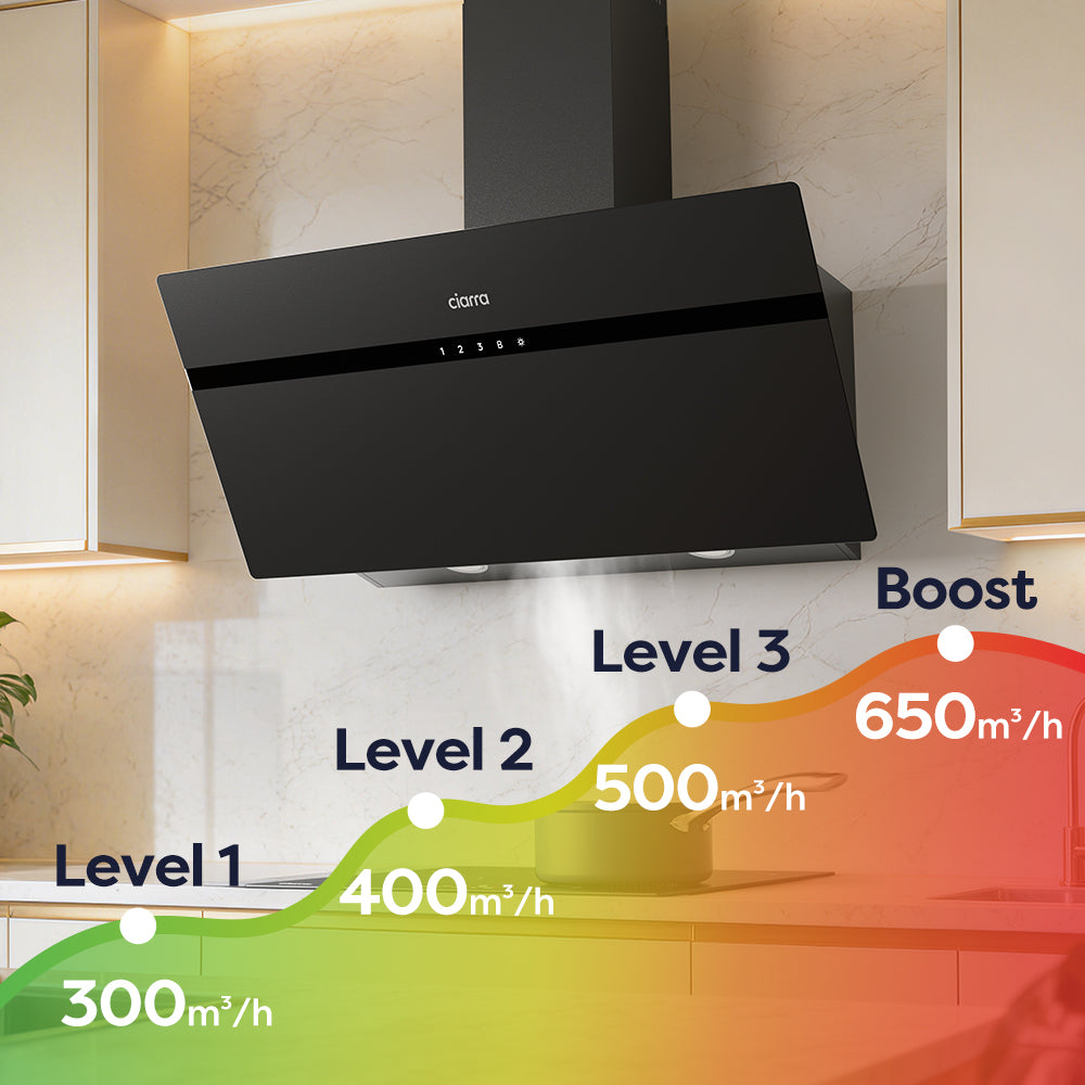 - 90cm wall mounted, maximum extraction 650m³/h, energy efficient: A+++