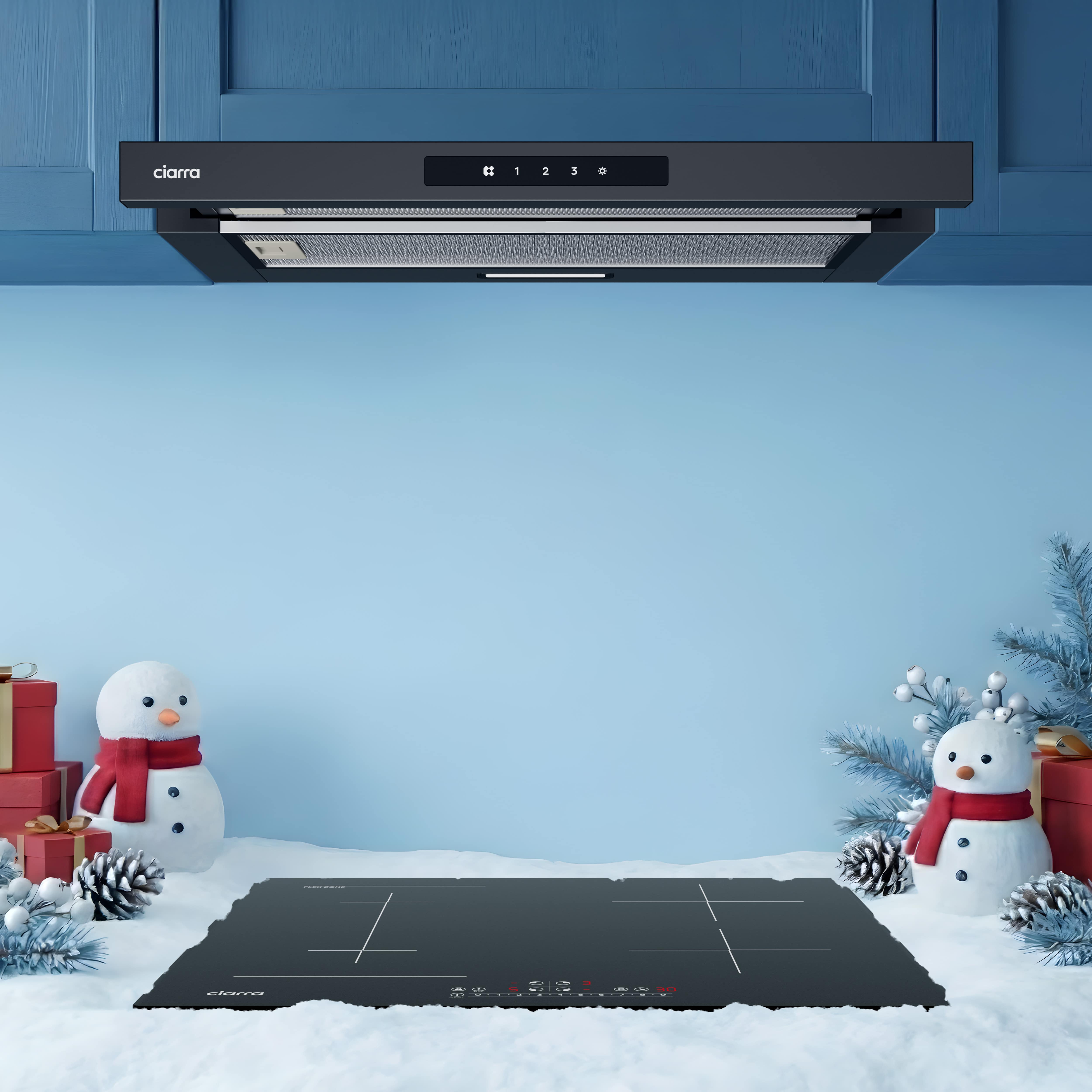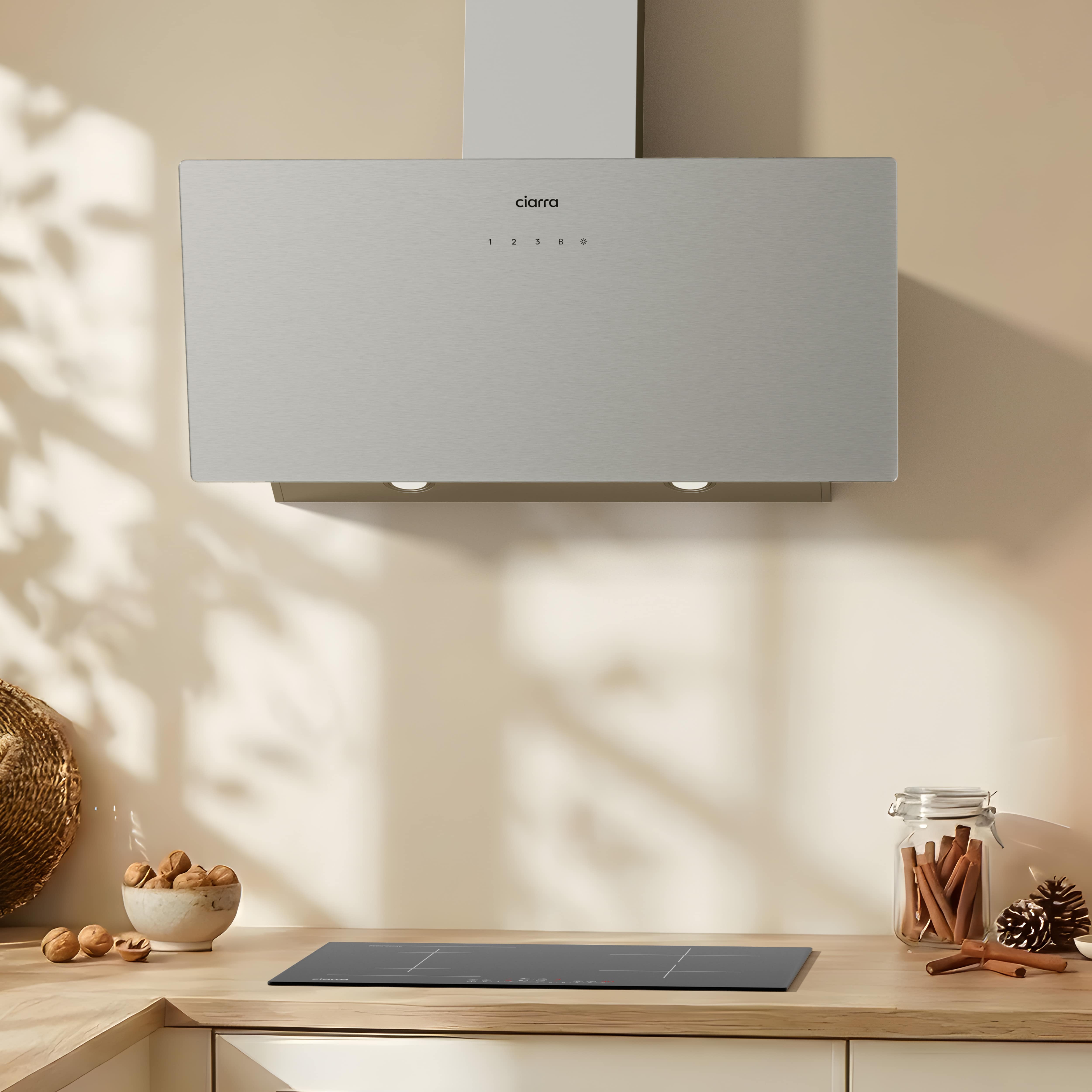 The Ciarra Pinnacle Island Cooker Hood offers similar high performance with a unique twist: its Ivory Mist Marble finish. This stylish, eco-friendly hood matches high suction power with elegant aesthetics, perfect for modern kitchens looking for a chic yet powerful ventilation solution.