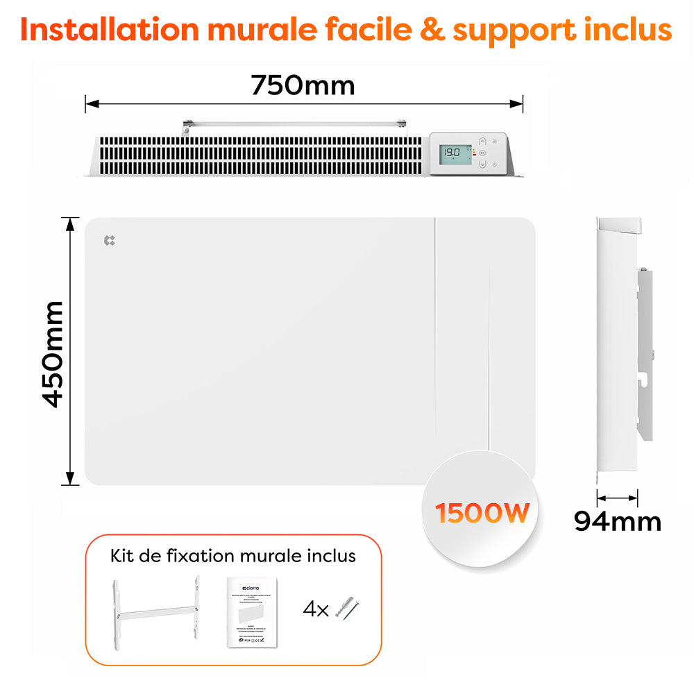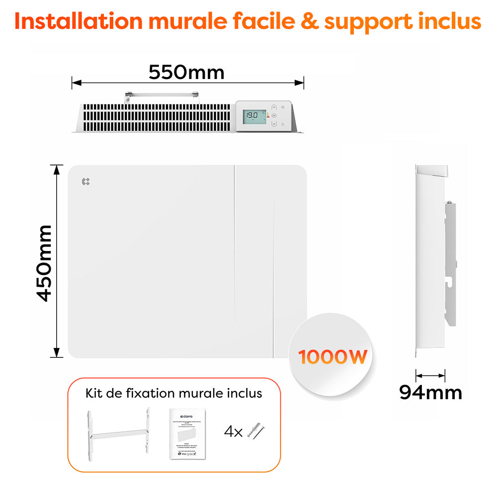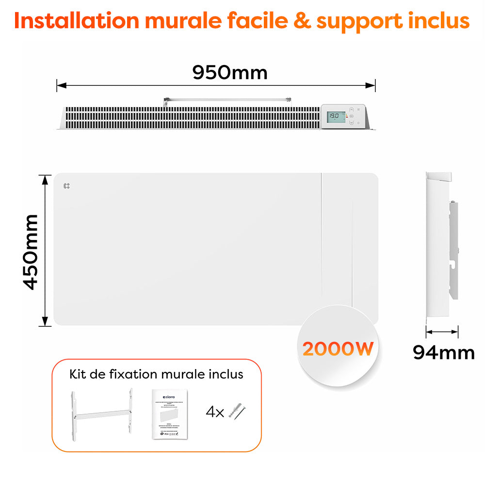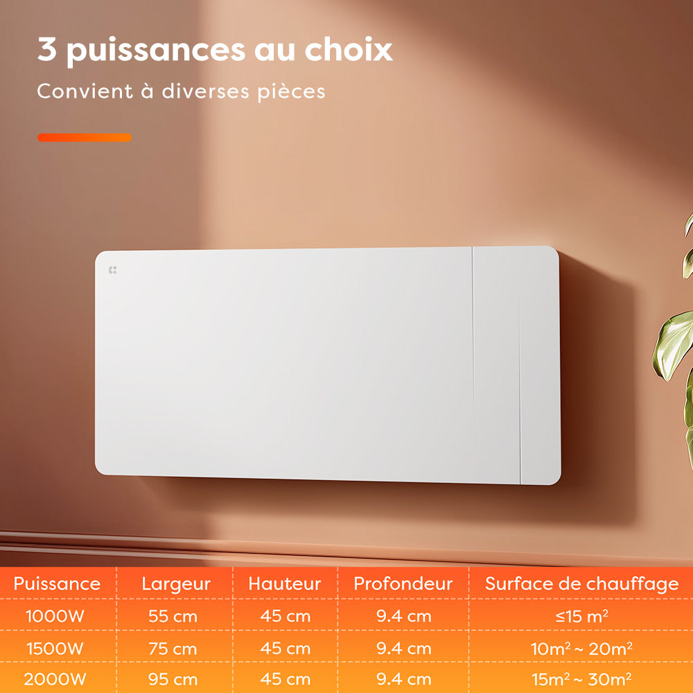 | Dimensions produit (L × P × H, cm) | 1000W : 55 × 9,4 × 45 1500W : 75 × 9,4 × 45 2000W : 95 × 9,4 × 45 |