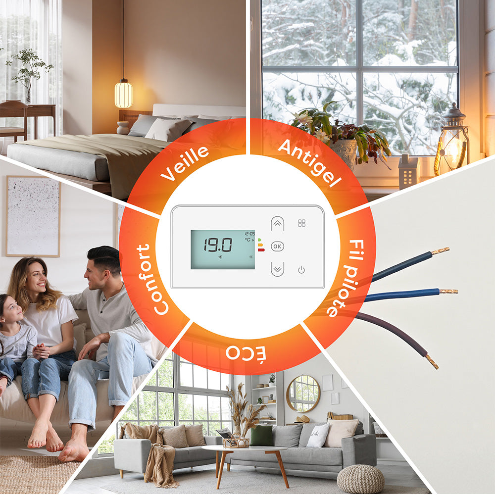 | Plage de température (°C) | Mode confort : 5~29°C Mode éco : 1,5~25,5°C Mode hors-gel : 7°C |