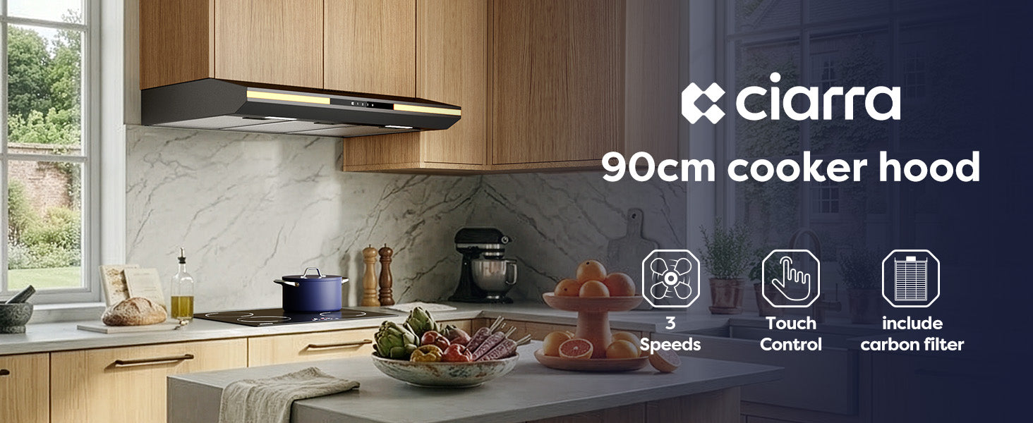 CIARRA 90cm Slim Under Cabinet Cooker Hood A+ Energy Class Black Touch Control Wall Mounted Range Hood with Carbon Filter CBCB90921-OW