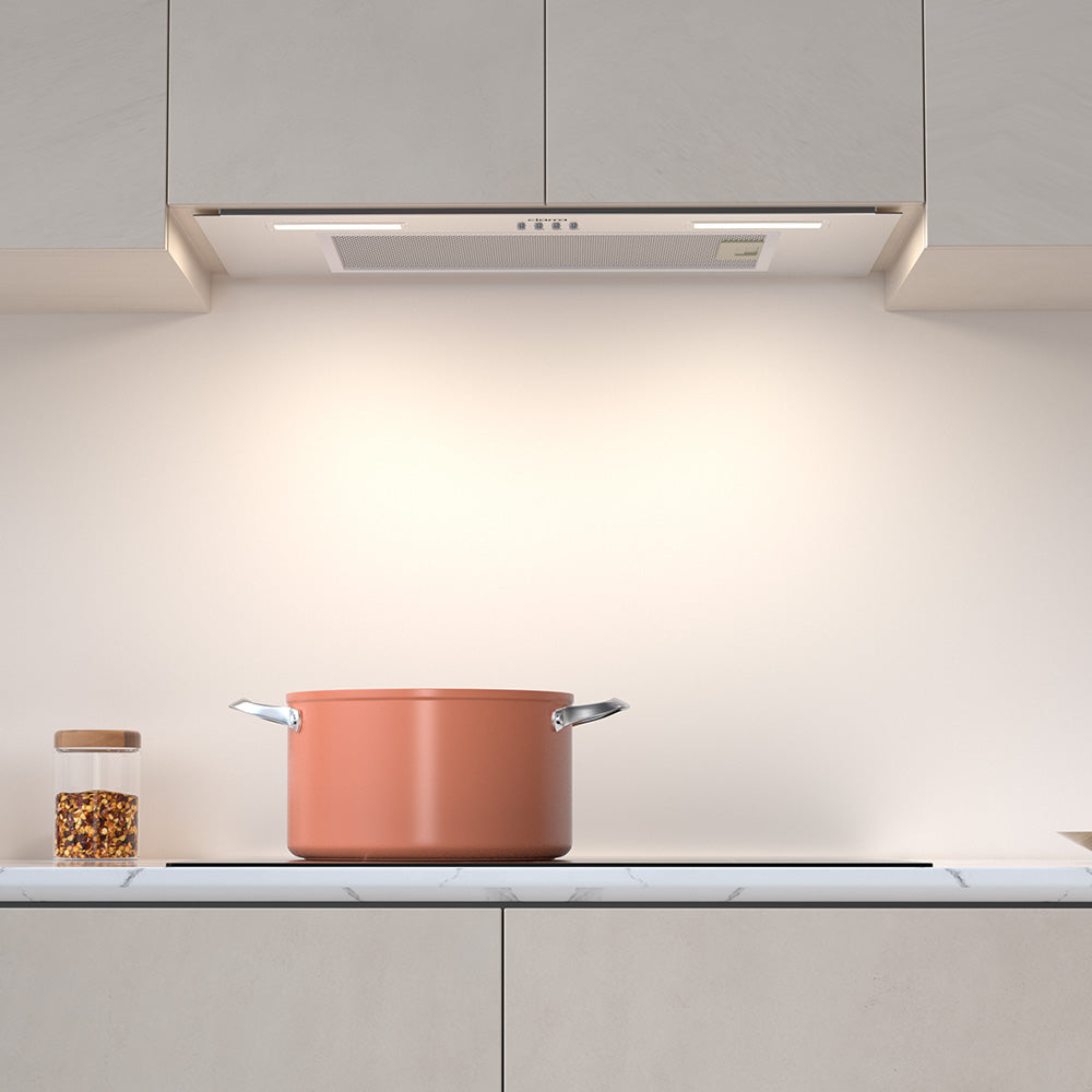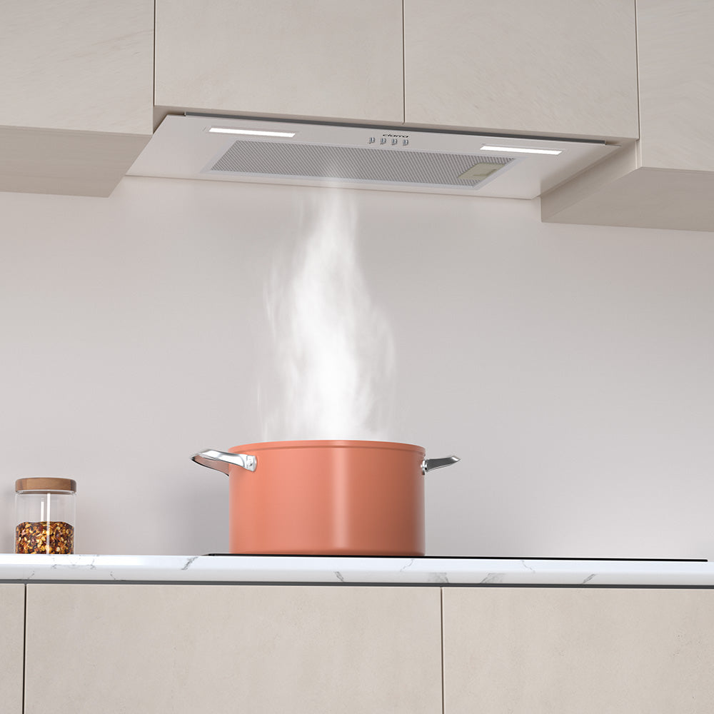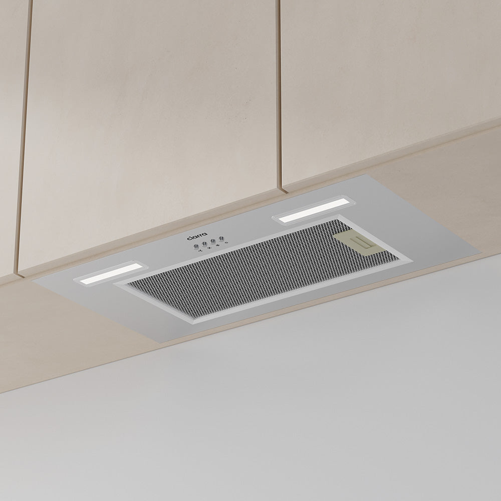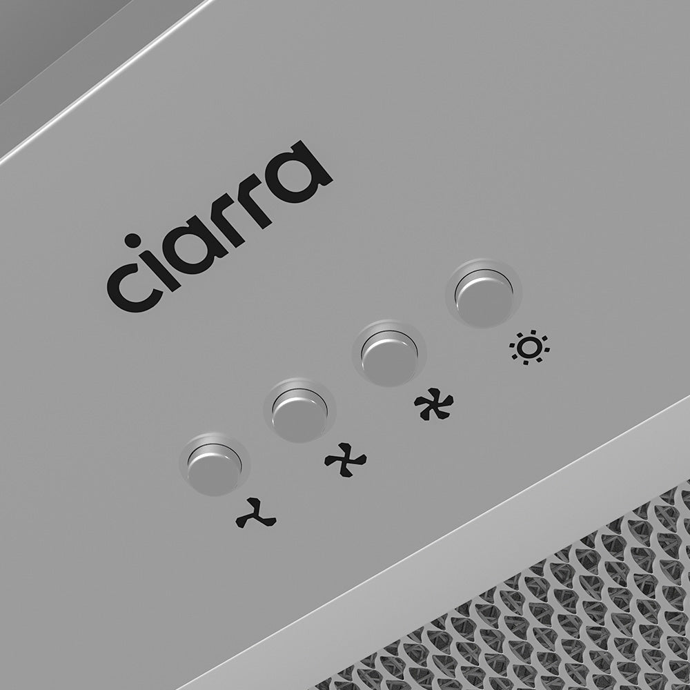 The Ciarra Integrated Cooker Hood is equipped with a dishwasher-safe aluminum grease filter, making it easy to clean. Simply remove the filter, place it in the dishwasher on a high-temperature setting, and it will be as good as new.